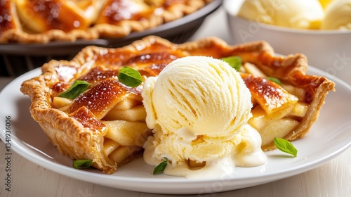 Vanilla ice cream apple pie dessert. Delicious apple pie with ice cream and mint garnish served on a plate.