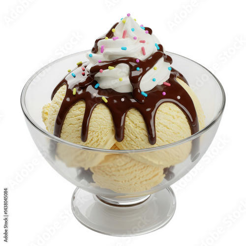 Vanilla Ice Cream Sundae: Chocolate Drizzle, Whipped Cream, and Sprinkles in Glass Bowl, Isolated on Transparent Background.