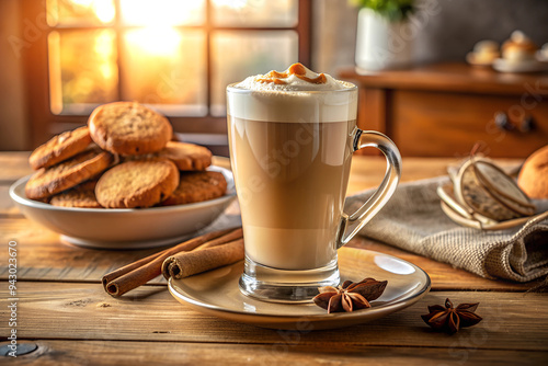 Vanilla Latte with Cinnamon Stick and Vanilla Pod Garnish Served with Cookies in Warm Kitchen Setting, Afternoon Sun
