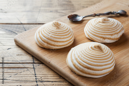 Vanilla marshmallow zephyr with caramel on a wooden table. Selective focus. Copy space.