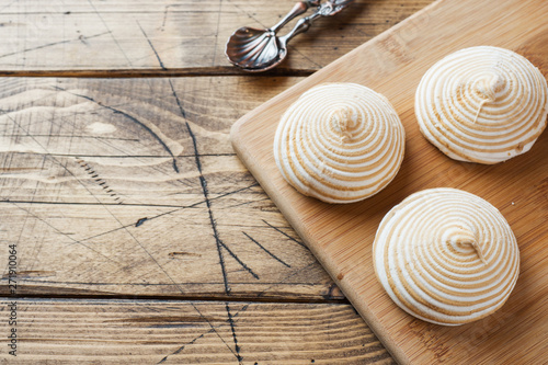 Vanilla marshmallow zephyr with caramel on a wooden table. Selective focus. Copy space.