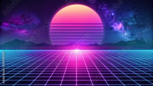 Vaporwave gradient scene with a vibrant sunset over a grid landscape and cosmic background