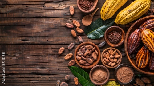 Varieties of cocoa products displayed on a wooden rustic background
