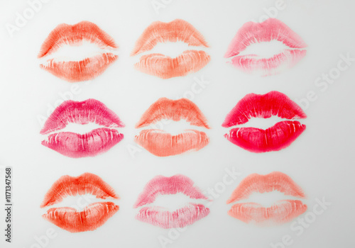Variety of lip prints arranged in a grid showcasing different shades of lipstick on a white background