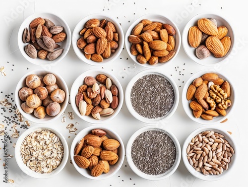variety of nuts and seeds like almonds, walnuts, chia seeds, and flaxseeds displayed in small bowls, showcasing their richness in healthy fats.