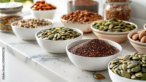 Variety of seeds bowl on white quartz counter top