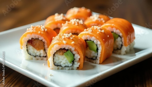 Variety of sushi rolls on white platter, soy sauce, fish, sauce