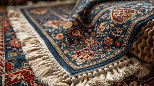 Variety of the gorgeous oriental carpets in traditional carpet store in Middle East. Pile of beautiful handmade carpets on the traditional Middle East market bazaar.