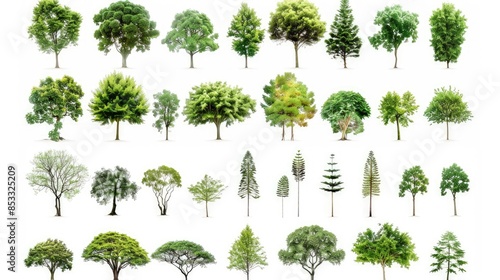 Variety of Trees - A comprehensive collection of different tree species isolated on a white background, showing diverse tree shapes and sizes