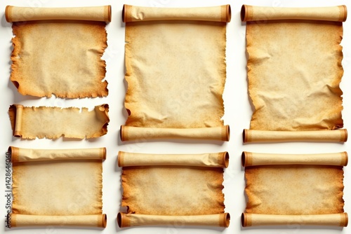 Variety of weathered parchment scrolls in different sizes and shapes, parchment, old, collection