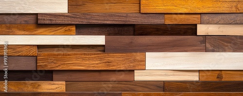Variety of wood planks arranged in overlapping layers, featuring different tones and textures, modern flooring material showcase