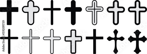 Various christian cross symbols in black and white displayed on a light gray background image design