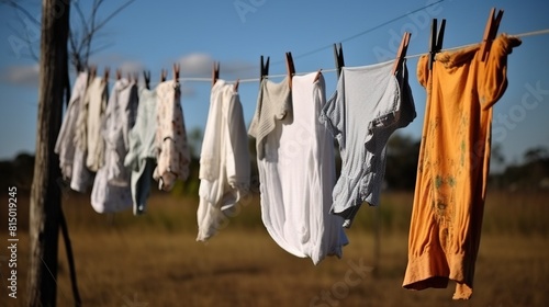 Various clean colored things dry on a clothesline against the background of the street. AI generated.