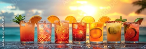 Various cocktails in glass glasses are on the bar counter against the background of the beach