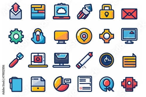 Various colored icons on a clean white background. Ideal for graphic design projects