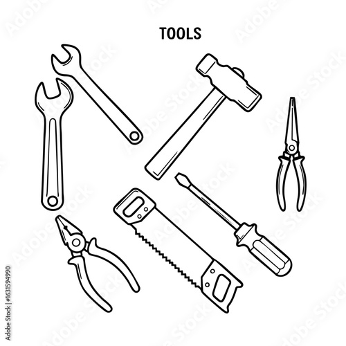 Various construction tools lie on white background: image FX. Construction tools include hammer, saw, screwdriver, wrench, and pliers. Concept image FX for tools ads or websites.