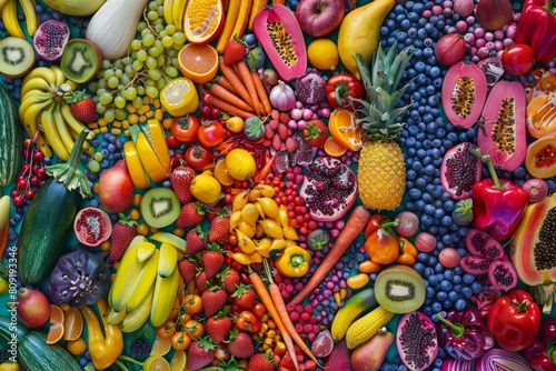 Various fresh fruits and vegetables are displayed in a colorful and organized arrangement, A colorful array of fruits and vegetables arranged in a vibrant pattern