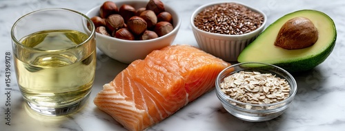 Various healthy food items like salmon and avocados are elegantly arranged in white bowls on a light grey marble surface