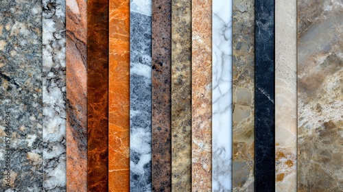 Various marble stone samples arranged vertically showcasing different colors and textures.