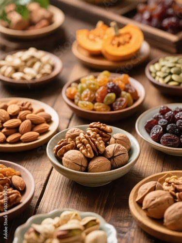 Various nuts and dried fruits are placed in wooden bowls on a wooden table, creating a healthy and delicious snack feast atmosphere.