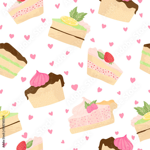 Various piece of cake and cheesecake vector seamless pattern in flat cartoons style. Happy birthday cake background with fruits and berries. Cute colorful dessert on white background with hearts.