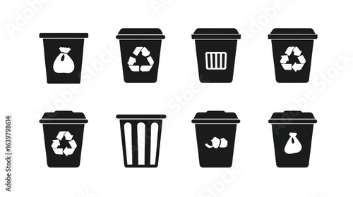 Various recycling and waste disposal bins in a modern design, ideal for promoting environmental awareness.