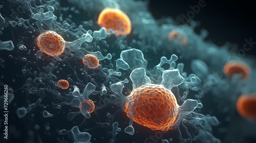 Various shapes of bacteria, probiotics under microscope, science, medicine concept background