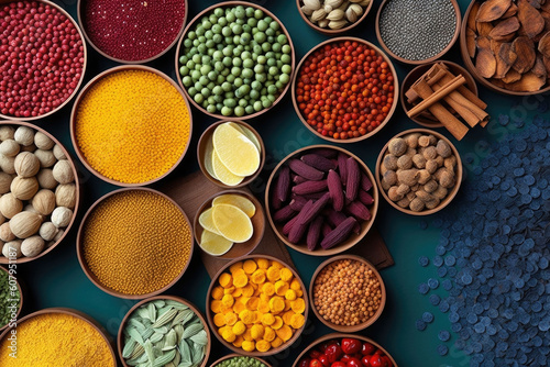 Various spice colorful background, top view. Texture with spices and herbs. Generative AI