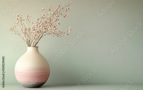 Vase with pink flowers sits on a table. The vase is tall and has a pink and white design