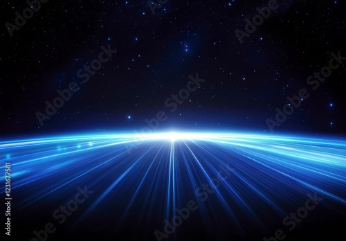 Vast Cosmic View with Radiant Light Beams and Starry Background, Ideal for Science Fiction and Futuristic Themes in Stock Photography