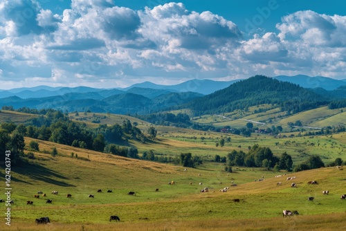 Vast countryside landscape with rolling hills, grazing cows, and lush fields under a bright blue sky