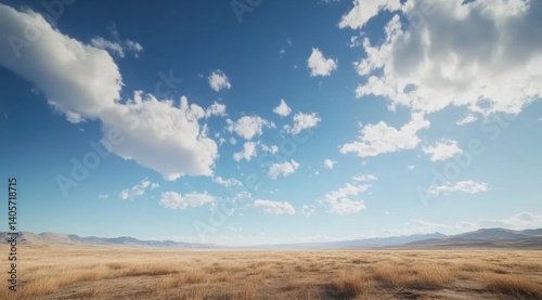 Vast desert landscape under a vibrant sky. A flat, dry, golden-brown plain stretches to distant, hazy mountains. A beautiful array of cumulus clouds dot a brilliant blue sky