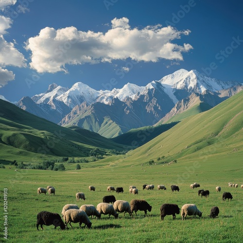 Vast grassland surrounded by undulating mountains and clouds in the sky, with grazing sheep
