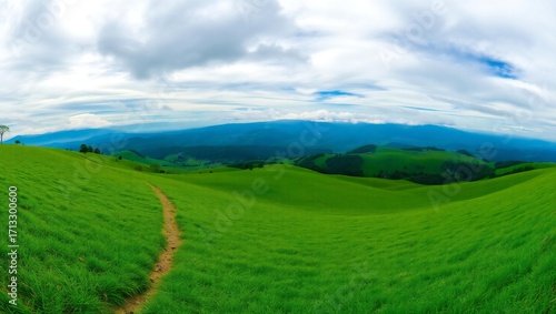 Vast green rolling hills under a dramatic cloudy sky with a winding path leading into distance