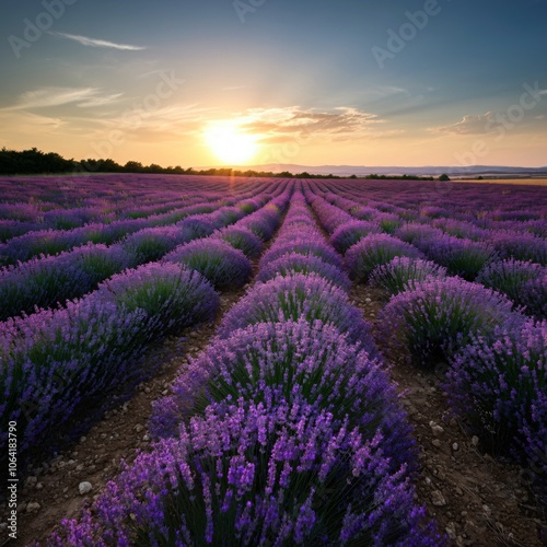 Vast lavender fields under a setting sun casting a golden glow over the landscape