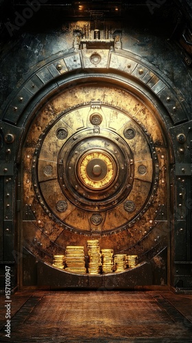 Vault door with stacked coins. Textured, circular mechanism. Secure, valuable, and treasure filled
