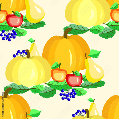 Vector - pumpkin with apples, pears and berries. Seamless pattern.
