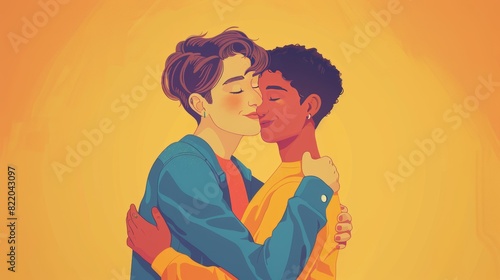 Vector 2D illustration of two LGBTQ characters sharing a hug, in a clean and minimalistic cartoon style Generative AI