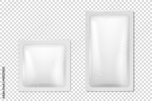 Vector 3d Realistic White Blank Packaging Icon Set Closeup Isolated. Coffee, Tea, Salt, Sugar, Spices, Wet Wipes Wrapper, Sachet. Design Template of Packing for Mockup. Top View