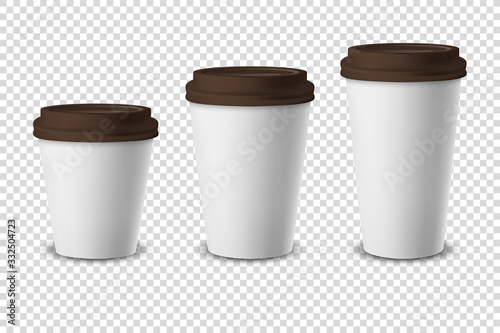 Vector 3d White Realistic Disposable Closed Paper, Plastic Coffee Cup for Drinks with Brown Lid Set Closeup Isolated on Transparent Background. Design Template, Mockup. Front View