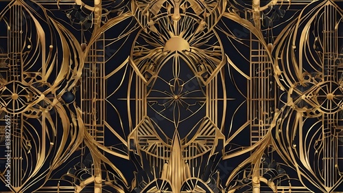 Vector abstract art deco luxury pattern featuring golden vintage geometric shapes, arches, and swirls.