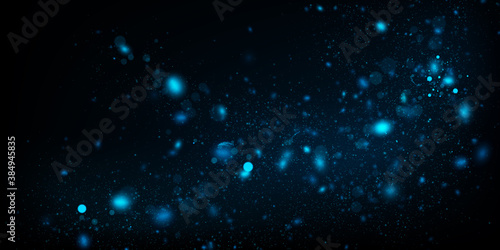 Vector abstract background with blue particles on dark. Glowing magical lights, sparkling glittering effect.