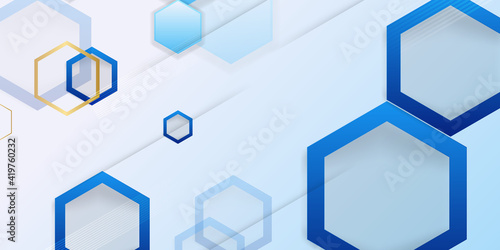 Vector abstract geometric background. Template brochure design. Blue hexagon shape with golden lines