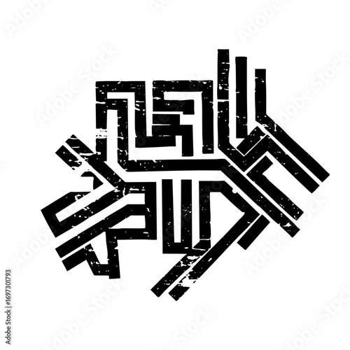 Vector Abstract geometric emblem with distressed texture features bold angular shapes.