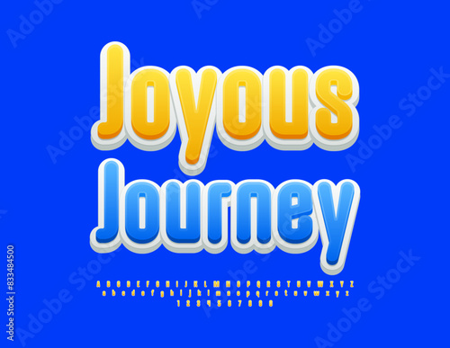 Vector advertising emblem Joyous Journey. Sunny Yellow Font. Modern Alphabet Letters and Numbers set.