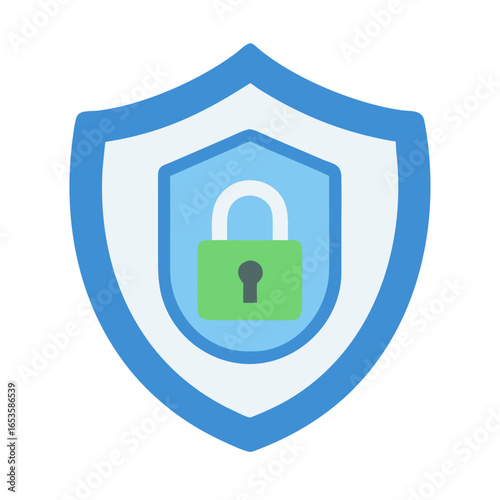 Vector art of a blue and white shield icon with a green padlock inside, symbolizing digital security and protection