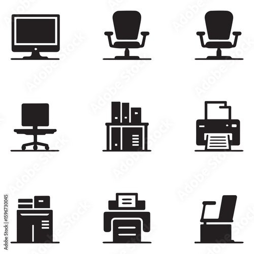 Vector art of a collection of office equipment icons features computers, chairs, printers, and storage cabinets for a modern workspace