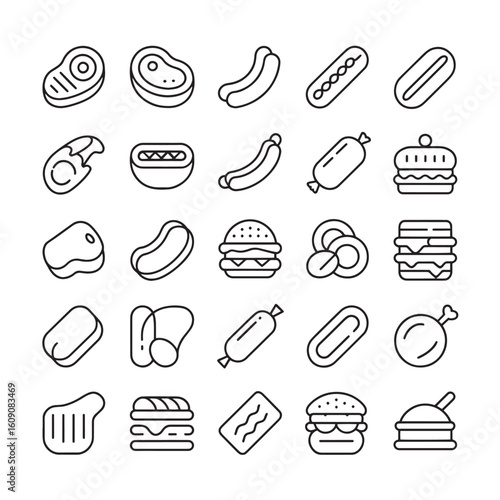 Vector art of a collection of outline icons representing various meats and fast food items