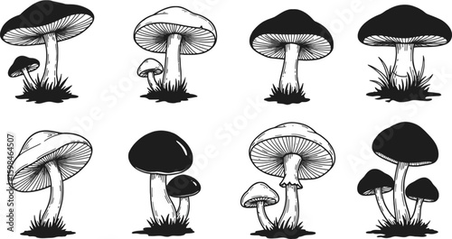 Vector art of a set of monochrome mushroom drawings isolated on white background offers a classic botanical aesthetic