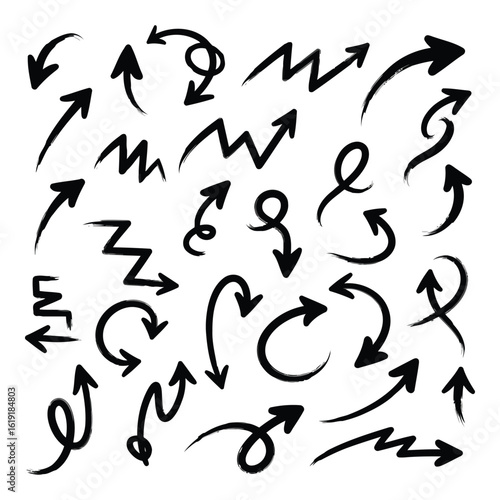 Vector art of a variety of handdrawn black arrows and pointers in different styles on a white background